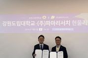 (케이엠뉴스) 강원도립대학교와 재생의학 기반 바이오 제약 기업인 ㈜파마리서치(대표이사 손지훈)가 지역 혁신 성장을 주도할 전문 인재 양성을 위해 손을 잡았다. 강원도립대학교는 2월 4일 대학 본부에서 파마리서치와 ‘산학협력 업무협약 및 현물 기탁식’을 개최했다고 밝혔다. 이번 행사는 양 기관이 앞서 서면으로 체결한 산학협력 협약의 내용을 공유하고, 파마리서치 측에서 기탁한 현물을 전달하기 위해 마련됐다. 양 기관은 이번 협약을 통해 대학과 기업이 보유한 역량을 결합해 지역 맞춤형 인재 양성을 위한 현장 밀착형 교육 생태계를 구축하기로 뜻을 모았으며, 영동지역 청년 인재 채용 활성화 및 실무형 전문 인력 양성, 객관적 취업 정보 공유, 산학 공동발전을 위한 구체적인 협력 사업을 함께 펼칠 예정이다. 특히 파마리서치는 이번 MOU 체결을 기념해 학생과 교직원에게 1천만원 상당의 자사 대표 제품을 기탁하며 학생들의 건강한 도전과 성장을 응원했다. 강원도립대학교 최종균 총장은 “글로벌 바이오 기업인 파마리서치의 소중한 기탁과 협력 약속에 깊은 감사를 드린다”며 “대학 또한 기업이 필요로 하는