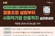 (케이엠뉴스) 김포시가 사회문제 해결을 위한 참신한 아이디어와 실행력을 갖춘 사회적경제기업 육성을 위해 ‘2026년 김포시 사회적경제 아카데미’를 개설하고, 오는 3월 3일까지 수강생을 모집한다. 이번 아카데미는 평소 사회적경제에 관심 있는 김포시민은 물론, 연내 협동조합 설립과 사회적기업 인증을 준비 중인 관내 기업, 단체라면 누구나 신청할 수 있다. 교육 과정은 ▲사회적기업 개념 및 인·지정 요건 ▲협동조합 개념, 설립 절차 및 인가 요건 ▲2026년 지원제도 등 사회적경제에 대한 기본 개념을 습득하고, 연내 진입을 위한 사전 준비가 가능하도록 실전형으로 구성했다. 특히 전문가 1:1 멘토링을 통해 ▲사업 아이템의 경쟁력 및 지속가능성 진단 ▲정관, 사업계획서 등 필수서류 작성 ▲심사 및 현장실사 대비 전략 등 기업 맞춤형 컨설팅이 후속으로 지원될 예정이다. 수강신청은 3월 3일까지 온라인으로 가능하며, 자세한 사항은 김포시청 홈페이지를 참조하거나 김포시청 지역경제과로 문의하면 된다. 김포시는 ‘일자리창출을 위한 재정지원’을 비롯해 ‘전략모델 개발비’, ‘교육·컨설팅’, ‘공공·민간