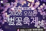 (케이엠뉴스) 오산문화재단은 오는 4월 3일 오후 6시 30분 오산천 야외무대(종합운동장 뒤편)에서 시민들과 함께하는 봄맞이 ‘2026 오산천 벚꽃 축제’를 개최한다. 이번 행사는 따뜻한 봄의 시작을 알리며 시민들에게 특별한 추억을 선사하기 위해 마련된 것으로, 가수 황민호의 축하 공연을 비롯해 점등식과 폭죽 퍼포먼스가 어우러져 오산천 일대를 화려한 봄밤의 분위기로 물들일 예정이다. 행사 당일에는 음악과 빛, 불꽃이 조화를 이루는 다양한 프로그램이 진행되며, 남녀노소 누구나 함께 즐길 수 있는 열린 문화행사로 시민들의 큰 호응이 기대된다. 오산문화재단 관계자는 “오산천에서 펼쳐지는 이번 축제가 시민들에게 특별한 봄밤의 추억으로 남길 바란다”며 “앞으로도 시민들이 일상 가까이에서 문화와 예술을 향유할 수 있도록 다양한 프로그램을 지속적으로 마련하겠다”고 밝혔다.