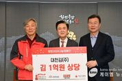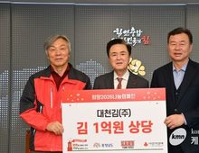 (케이엠뉴스) 충남도는 대천김으로부터 1억원 상당의 김을 기탁받았다고 27일 밝혔다. 이날 도지사 외부접견실에서 열린 전달식에는 김태흠 지사를 비롯해 최민순 대천김 총괄대표, 성우종 충남사회복지공동모금회장 등이 참석해 나눔의 의미를 함께했다. 이번에 기탁된 김은 충남사회복지공동모금회를 통해 경제적 어려움을 겪고 있는 이웃들에게 전달될 예정이다. 김 지사는 “지역 기업의 따뜻한 나눔이 취약계층에게 큰 위로와 도움이 될 것”이라며 “기탁된 물품을 꼭 필요한 분들께 전달하겠다”고 말했다. 최민순 총괄대표는 “지역사회와 함께 성장해온 기업으로서 어려운 이웃에게 조금이나마 보탬이 되고자 했다”며 “앞으로도 지속적인 나눔을 통해 사회적 책임을 다하겠다”고 답했다.
