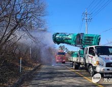 (케이엠뉴스) 충남소방본부와 서산시는 장기화되는 건조특보와 강풍으로 산불 위험이 커짐에 따라 산불 발생 가능성을 사전에 차단하고자 광역 방제기를 활용한 예비주수 활동을 본격 추진한다고 2일 밝혔다. 이번 예비주수 활동은 전국 대부분 지역에 건조특보가 지속되고 있어 작은 불티가 급격한 산불로 확산할 우려가 커진 데 따른 선제적 조치로, 도 소방본부의 요청을 서산시가 적극 받아들여 추진한다. 예비주수는 작은 불티 하나가 마을과 도시를 위협하는 상황에서 산림 경계와 주거지, 주요 시설 주변에 습도를 높이고 착화 가능성을 낮춰 불길이 닿기 전에 차단하는 것으로 산불 예방의 핵심 전략이다. 실제 국립소방연구원의 비상 소화장치 실험 결과에 따르면, 3분만 물을 뿌려도 비화에 의한 착화를 효과적으로 차단할 수 있는 것으로 확인된 바 있다. 이에 도 소방본부는 예비주수를 위해 서산시 농업기술센터가 보유 중인 한 번에 3000리터의 물을 적재할 수 있는 광역 방제기를 사용할 계획이다. 광역 방제기는 분당 420리터를 미세 분무 형태로 방사할 수 있는 대형 살포 설비로, 최대 150미터까지 균일한 살수가 가능하다.