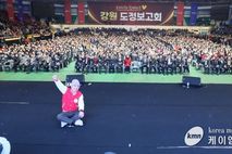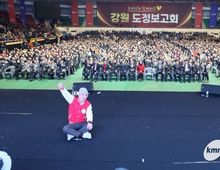 (케이엠뉴스) 강원특별자치도는 3월 15일 오후 1시30분, 원주 치악체육관에서 '도민과 함께하는♥ 강원 도정보고회' 원주권 행사를 개최했다. 이번 보고회는 2026년 도정 운영 방향인 ‘도민공감 행정’을 현장에서 실현하기 위해 마련된 자리로, 지난 춘천권 행사에 이어 두 번째로 열렸다. 이 자리에서는 도정의 주요 정책과 현안을 도민에게 직접 설명하고 현장의 목소리를 듣기 위한 소통의 장으로 진행됐다. 이날 행사에는 원주권역 도민 7천여 명이 참석해 체육관을 가득 메우며 높은 관심을 보였다. 유상범 국회의원과 박정하 국회의원, 김시성 도의회 의장, 원강수 원주시장, 김명기 횡성군수, 최명서 영월군수, 심재국 평창군수, 신경호 도 교육감 등 주요 인사도 함께해 도정 현안과 지역 발전 방향에 힘을 모았다. 김진태 도지사는 보고회에서 PPT를 활용해 도정 주요현안을 직접 설명했다. 먼저, 김 지사는 '강원특별법 3차 개정안' 추진상황을 보고하며 “통합특별시 출범으로 강원도와 강원특별법이 절대 소외되어서는 안된다”고 재차 강조했다. 이어 “강원특별법 3차 개정안이 내일 국회 심사에 오르기로 되어 있는데,