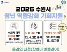 (케이엠뉴스) 수원특례시는 미취업 청년의 취업 준비 비용 부담을 덜어주는 ‘청년 역량강화 기회 지원 사업’을 12월 4일까지 운영한다. 미취업 청년에게 어학·자격시험 응시료를 1인당 연 최대 30만 원 지원한다. 지원 대상은 신청일 기준 수원시에 거주하는 19~39세(1986년생~2007년생) 미취업 청년이다. 2025년 12월 1일 이후 어학·자격시험의 응시자 중 시험 응시일 당시 미취업자인 청년이 신청할 수 있다. 단기간 근로자는 미취업자로 인정한다. 지원 분야는 총 1005종으로 ▲어학 19종 ▲한국사 ▲국가기술자격 541종 ▲국가전문자격 345종 ▲국가공인 민간자격 99종이다. 응시 횟수와 신청 횟수 제한은 없지만 동일 시험은 연 최대 3회까지 지원한다. 신청은 경기도일자리재단 통합접수시스템 ‘잡아바 어플라이’에서 온라인으로 할 수 있다. 예산이 소진되면 조기 마감될 수 있다. 상반기 예산이 소진되면 9월 1일부터 하반기 신청을 다시 받는다. 수원시 관계자는 “청년들에게 인기가 높은 사업으로 조기 마감될 수 있는 만큼 지원 대상과 접수 기간을 확인해 신청하길 바란다”며 “취업 준비에 실질적으