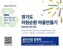 (케이엠뉴스) 경기도가 주민 주도의 자원순환 실천 확산을 위해 ‘2026년 자원순환마을 만들기’ 공모사업을 추진하고, 오는 3월 30일부터 참여 공동체를 모집한다. 이번 사업은 마을 단위에서 발생하는 생활폐기물 문제를 주민 스스로 해결하고 지속가능한 순환경제 체계를 구축하는 주민참여형 모델이다. 경기도는 올해 총 18개 마을을 선정해 유형별로 사업비를 차등 지원한다. 지원 분야는 ▲자원순환거점 조성(8개소, 최대 3,000만 원) ▲자원순환마을 활성화(8개소, 최대 1,700만 원) ▲자원순환캠퍼스 조성(2개소, 최대 1,500만 원) 등 세 가지다. 특히 올해는 대학 내 자원순환 문화를 확산하기 위한 ‘자원순환캠퍼스’ 유형을 포함해 참여 주체를 학생과 청년층까지 넓혔다. 선정된 공동체는 오는 4월부터 12월까지 약 9개월간 마을별 특색에 맞는 자원순환 활동을 펼치게 된다. 주요 사업 내용은 실생활과 밀접한 체감형 프로그램으로 구성된다. 구체적으로는 ▲분리배출 및 자원순환 교육 ▲일회용품 없는 마을축제 기획 ▲커피박·폐현수막을 활용한 업사이클링 ▲투명 페트병 분리수거 체계 구축 ▲자원순환 거점공간 조성 및 운영