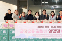 (케이엠뉴스) 이재식 수원특례시의회 의장은 2월 6일 오후, 권선1동 행정복지센터에서 열린 설 명절 이웃사랑 나눔 전달식에 참석했다. 이날 전달식에는 김은경 의원(더불어민주당, 세류1·2·3·권선1)도 함께했다. 이 자리는 설 명절을 앞두고 지역 내 저소득 가구에 따뜻한 정을 전하기 위해 마련됐으며, 권선1동 단체장과 시·도의원, 주민 등이 함께했다. 전달식에서는 관내 저소득가구 447가구를 대상으로 온누리상품권과 식료품, 생필품 등이 전달됐으며, 사회복지공동모금회 기금과 지역 후원을 통해 지원이 이뤄졌다. 이재식 의장은 “명절을 앞두고 이웃을 먼저 생각하는 나눔이 지역사회에 큰 힘이 된다”며 “의회도 시민 삶에 온기를 더하는 나눔이 이어질 수 있도록 함께하겠다”고 말했다.