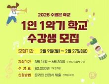 (케이엠뉴스) 수원문화재단이 오는 27일까지 시민 누구나 참여할 수 있는 ‘2026 수원은학교 1인 1악기 학교’ 수강생을 선착순으로 모집한다. ‘1인 1악기 학교’는 문화도시 수원 조성사업의 일환으로 운영되는 사업으로, 시민들에게 악기를 배울 수 있는 기회를 제공하고 일상 속 문화예술 활동을 장려하고자 마련됐다. 올해 상반기 과정은 대금, 소금, 해금, 플루트 등 성인 대상 수업, 자녀와 부모가 함께 배우는 미니하프 수업 등 전통악기와 서양악기를 아우르는 5개 강좌로 구성됐으며, 복합문화공간 111CM과 지혜샘어린이도서관에서 운영된다. 강좌는 3월 14일부터 순차적으로 개강하며, 6월 30일까지 주 1회씩 총 16회에 걸쳐 이루어진다. 특히 악기를 갖고 있지 않은 수강생을 위해 무료로 악기를 대여해줘, 누구나 부담 없이 신청할 수 있다. 수강신청은 온라인을 통해 진행되며 수강료는 강좌당 8만 원이다. 수원문화재단 관계자는 “‘1인 1악기 학교’는 악기 초보자도 부담 없이 시작할 수 있도록 모든 강좌를 초급 과정으로 구성했다”며, “악기 수업이 새로운 취미를 발견하고 문화예술을 가까이에서 즐길 수