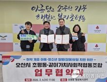 (케이엠뉴스) 오산시 초평동 행정복지센터는 지난 4일 지역 내 차상위계층 청소년과 아동의 건강한 성장 지원과 의료비 부담 완화를 위해 같이가치사회적협동조합과 질병(상해)보험료 지원을 위한 업무협약을 체결했다고 밝혔다. 이번 협약은 질병이나 사고 발생 시 의료비 부담으로 어려움을 겪을 수 있는 청소년·아동 가구를 선제적으로 보호하고, 일상생활 중 발생 가능한 질병과 상해에 대비한 실질적인 안전망을 구축하기 위해 마련됐다. 협약에 따라 양 기관은 ▲청소년·아동 질병(상해)보험료 지원 ▲대상자 발굴 및 관리 ▲지속 가능한 민관 협력 복지사업 추진 등에 상호 협력하며, 복지 사각지대에 놓인 청소년과 아동의 돌봄 공백을 최소화하는 데 힘쓸 예정이다. 이기영 초평동장은 “아이들이 건강하고 안전하게 성장할 수 있는 환경을 만드는 것은 지역사회의 중요한 책무”라며 “이번 협약을 계기로 청소년과 아동의 건강 보호를 위한 행정적 지원을 지속적으로 강화해 나가겠다”고 밝혔다. 한편, 초평동 행정복지센터는 앞으로도 지역 내 민간 자원과의 협력을 통해 청소년·아동 대상 맞춤형 복지사업을 적극 발굴하고, 생활 밀착형 돌봄과