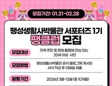 (케이엠뉴스) 팽성생활사박물관은 서포터즈 1기 ‘팽클럽’에 참여할 지역 주민을 비롯해 문화 활동에 관심 있는 시민(20세 이상)을 오는 2월 28일까지 모집한다고 밝혔다. 이번 프로그램은 지역민과 박물관을 유기적으로 연결함으로써 지역의 역사·문화에 대한 이해를 높이고, 공동체의 문화적 자긍심을 함양하는 데 목적을 두고 마련됐다. 서포터즈(supporters)는 ‘지지자, 후원자, 팬’을 의미하며, 어떤 대상을 지지하고 응원하는 사람 또는 단체를 의미한다. 서포터즈 활동에서는 ▲전시·교육 모니터링 및 의견 제시 ▲홍보 콘텐츠 제작 ▲팽성 지역 문화자원 조사·참관 등이 포함된다. 이를 통해 참여자들의 문화활동 전반에 대한 폭넓은 경험을 쌓을 기회가 제공된다. 활동 참여자에게는 해당자에 한하여 자원봉사 시간이 인증되며, 팽성 지역 내 주요 유적지 답사와 교육 기회가 제공된다. 또한 모든 활동을 마친 참여자에게는 공식 활동 인증서와 박물관 기념품이 제공된다. 활동은 3월부터 12월까지 총 10개월간 진행된다. 팽성생활사박물관 공식 블로그에서 신청서를 내려받아 이메일로 접수하면 된다. &nb