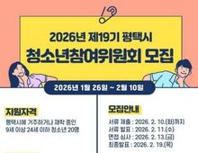 (케이엠뉴스) 평택시와 평택시청소년재단은 청소년 정책 참여 기회를 확대하고 자치 역량을 강화하기 위한 2026년 제19기 청소년참여위원회 위원 20명을 공개 모집한다고 밝혔다. 청소년참여위원회는 '청소년기본법'과 '평택시 청소년참여위원회 운영 조례'에 근거해 운영되는 청소년 참여기구로, 청소년들이 직접 지역사회 정책을 논의하고 제안하는 역할을 한다. 이번에 모집하는 제19기 위원회 활동 기간은 2026년 3월부터 2027년 2월까지 1년간이며 평택시에 거주하거나 평택시 소재 학교에 재학 중인 9세 이상 24세 이하 청소년이라면 누구나 지원할 수 있다. 선발된 위원들은 △청소년 정책 포럼 및 토론회 개최 △청소년 권리·인권 모니터링 △청소년 정책과제 발굴 및 제안 △온오프라인 정책 창구 운영 △경기도 내 청소년참여위원회 교류 활동 등 다양한 정책 참여 활동에 참여하게 된다. 특히 위원들에게는 평택시장 명의의 위촉장 수여, 정기회의 참석 시 수당 지급, 활동 내용 생활기록부 기재, 청소년 정책제안대회 및 각종 대회 참여 기회 제공 등 실질적인 활동 혜택이 주어진다. 모집 기간은 공고일로부터