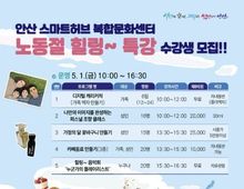 (케이엠뉴스) 안산시는 올해 법정공휴일로 지정된 노동절(5월 1일)을 맞아 안산 스마트허브 복합문화센터(단원구 동산로 63)에서‘노동절 힐링 특강’을 운영한다고 15일 밝혔다. 이번 특강은 노동자들이 가정의 달인 5월의 시작에 가족과 소중한 사람들과 함께 다양한 체험을 하며 재충전할 수 있도록 마련됐다. 프로그램은 ▲디지털 캐리커처(가족 액자 만들기) ▲퍼스널 조향 클래스 ▲가정의 달 꽃바구니 만들기 ▲카페음료 만들기(3종) ▲힐링~ 음악회‘누군가의 플레이리스트’ 등으로 구성됐다. 수강 신청은 오는 16일부터 선착순으로 접수한다. 프로그램 내용과 신청 방법 등 자세한 사항은 안산 스마트허브복합문화센터 누리집을 참고하거나 전화로 문의하면 안내받을 수 있다. 수강료는 전액 무료다. 이민근 안산시장은 “이번 특강이 노동자들이 일상 속 스트레스를 덜고 가족과 함께 활력을 찾는 계기가 되길 바란다”며 “앞으로도 시민들이 누릴 수 있는 다양한 문화·학습 프로그램을 마련해 나가겠다”고 말했다. 한편, 2021년 3월 개관한 안산 스마트허브복합문화센터는 안산시 재직 노동자와 시민들에게 여가와 커뮤니티