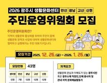 (케이엠뉴스) (재)광주시문화재단은 광주시 생활문화센터(만선·광남·고산·신현)에서 2026년에 활동할 주민운영위원회 위원을 통합 공개 모집한다고 밝혔다. 광주시문화재단은 2023년도 만선·광남 생활문화센터를 개관하고 주민운영위원회를 구성하고 운영해 왔다. 이번 모집은 작년 말 임기 만료와 개관으로 인하여 신규 모집이 필요한 광남·고산·신현 센터와 충원이 필요한 만선 센터가 함께 모집한다. 총 43명 구성을 계획하고 있으며, 광남·고산·신현 3개 센터는 각 12명, 만선 센터는 25년도 연임 위원을 제외한 7명을 충원한다. 참여 자격은 공고 모집일 기준 만 19세 이상으로 ▲ 관내 주민등록이 되어 있는 사람 ▲관내 소재 직장인 및 단체 종사자 중 하나에 해당하는 시민은 누구나 신청할 수 있다. 이전에 주민운영위원으로 활동했던 시민도 지원할 수 있으나, 신규 위원을 우선 모집한다. 선정된 위원은 2026년 2월부터 1년간 활동하며 1회 연임할 수 있다. 주민운영위원회는 생활문화센터의 지속 가능한 발전을 도모하기 위해 주민이 직접 생활문화 정책을 제안하고 실행하는 자치 대표기구이다. ‘우리 동네 문화를 주민 스스로
