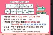 (케이엠뉴스) 속초교육도서관은 관내 학생 및 학부모·지역주민들의 지속 가능한 배움을 통한 자기성장을 위해 ‘2026년 문화활동강좌’ 수강생을 모집한다. 이번 강좌는 3월 19일부터 12월 12일까지 운영되며, 초등학생 대상 △어린이 글로 표현하는 세상 등 7개 강좌, 중·고등학생 대상 △핵심을 잡아주는 고등논술 등 2개 강좌, 학부모·지역주민 대상 △포토샵 자격증반 등 5개 강좌로 총 14개 프로그램이 운영된다. 수강 신청은 2월 12일부터 2월 26일까지 속초교육도서관 누리집을 통해 신청 가능하며, 스마트폰 활용교육 강좌는 방문을 통해 선착순으로 신청할 수 있다. 김주희 관장은 “지역주민 누구나 학습을 통해 배우고 성장할 수 있도록 평생교육의 기회를 지속적으로 확대·지원할 것이다.”라고 전했다. 자세한 내용은 속초교육도서관 누리집 공지사항을 참고 하거나 담당자에게 문의하면 된다.