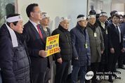(케이엠뉴스) 9일부터 국회 천막농성을 이어가고 있는 김진태 강원특별자치도지사가 2월 10일 국회 행정안전위원회 제1법안심사소위원회 회의실 앞에서 ‘투쟁’이라고 적힌 머리띠를 두르고 강원특별자치도법 3차 개정안의 조속한 심사를 강력 촉구했다. - 이날 국회 행안위 법안심사소위에서는 행정통합특별법이 상정돼 심사가 진행 중이며, 해당 법안은 11일까지 논의가 이어질 예정이다. 이 자리에는 유상범 국회의원(홍천・횡성・영월・평창)도 ‘강원도민의 삶을 바꾸는 선택. 강특법 3차 개정 즉각 통과’라고 적힌 피켓을 들고 행정안전위원회 의원들에게 강원특별법 3차 개정안의 조속한 처리를 요청했다. 김 지사는 “행정통합 시도인 5극은 빠른 속도로 국회 심사대에 오른 반면, 정부 부처 협의까지 마친 강원특별법 3차 개정안은 17개월 째 단 한 차례도 법안심사 논의가 이뤄지지 않았다”며 강한 유감을 표했다. 이어 “강원・전북・제주・세종, 이른바 3특과 행정수도 특별법안 역시 균형발전 차원에서 신속히 처리돼야 한다”고 강조했다.