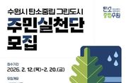 (케이엠뉴스) 수원특례시가 ‘생활 속 탄소중립 실천’을 확산하기 위해 2월 12일부터 20일까지 탄소중립 그린도시 사업 대상지 주민·생활권자를 대상으로 ‘수원시 탄소중립 그린도시 주민실천단’ 신규 참여자를 모집한다. 주민실천단은 탄소중립 그린도시 사업 대상지 주민과 생활권자로 구성된 시민 참여 조직이다. 지역 내 탄소중립 실천 활동과 홍보, 주민 참여 활동 등을 한다. 특히 수원시는 올해 주민실천단을 70명 규모로 확대 운영할 계획이다. 지난해 운영 성과를 바탕으로 신규 참여자를 모집해 참여 기반을 넓히고, 일회성 캠페인을 넘어 생활 속 실천이 자연스럽게 이어지는 탄소중립 문화를 확산할 계획이다. 모집 대상은 고색동·오목천동·탑동·서둔동·호매실동·평동·평리동 일부 등 탄소중립 그린도시 사업 대상지 거주민과 해당 지역 생활권자다. 주민실천단은 자원봉사 형태로 활동하며 ▲생활 속 탄소 저감 실천 ▲지역 맞춤형 실천 활동 ▲탄소중립 실천 홍보 ▲분과 활동, 회의 ▲역량 강화 교육 등에 참여한다. 수원시는 탄소중립 그린도시 주민실천단 확대 운영에 맞춰 참여자 역량을 높이는 교육과 분과별 실천