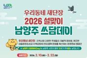 (케이엠뉴스) 남양주시는 10일부터 22일까지 시 전역에서 ‘설맞이 우리동네 새단장 남양주 쓰담데이 집중 추진기간’을 운영한다고 밝혔다. 이번 집중 추진은 설 명절을 앞두고 생활권 주변 환경을 정비하고 시민이 일상 속에서 실천하는 환경정화 활동을 확산하기 위해 마련됐다. ‘남양주 쓰담데이’는 시가 운영하는 대표적인 시민참여형 환경정화 프로그램이다. 특히 이번 쓰담데이는 행정안전부가 추진하는 전국 단위 환경정화 캠페인 ‘우리동네 새단장’과 연계해 추진한다. 지역별·단체별 자율 참여를 통해 공동체 중심의 환경 개선 활동을 확산하는 데 의미를 둔다. 2026년 현재 쓰담데이에는 약 5,200명과 277개 단체가 참여한다. △환경보호단체 △지역사회단체 △우리아파트봉사단 △상인회 등 다양한 주체가 정기적인 활동을 이어가고 있다. 시는 이번 집중 추진기간을 통해 명절 전 도시 환경을 정비하고, 시민 주도의 환경보전 실천 분위기를 확산시킬 방침이다. 이후에도 시민 중심의 자율적인 마을 단위 쓰담데이를 위한 행정적 지원을 지속할 계획이다. 쓰담데이 참여를 희망하는 시민은 남양주시 자원봉사센터 또는 거