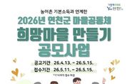 (케이엠뉴스) 연천군 마을공동체지원센터가 농어촌기본소득과 연계한 ‘2026년 희망마을 만들기 주민공모사업’ 참여 공동체를 모집한다. ‘희망마을 만들기 공모사업’은 지역의 인적·물적 자원을 활용해 주민 스스로 마을의 문제점을 발굴하고 해결 방안을 모색해 실행할 수 있는 마을 단위의 주민 주도형 공동체 활동 지원사업으로, 총 10개 공동체를 선정해 팀당 최대 200만 원을 지원할 계획이다. 올해 희망마을 만들기 공모사업은 5월 중 1차 서류심사 및 2차 발표심사를 거쳐 6월 최종 선정되며, 기존과는 다르게 이음메이커(공동체지원활동가)를 공동체와 연계해 현장 밀착형 지원을 강화한다. 이음메이커는 사업 추진 과정에서 공동체가 어려움을 겪는 정산 업무와 운영 방향 설정을 함께 고민하고, 실질적인 활동 역량을 높일 수 있도록 맞춤형 지원을 제공할 예정이다. 신청 대상은 농어촌기본소득을 수급하는 5인 이상의 주민 모임이며, 환경·생태, 돌봄·나눔, 마을 경제, 마을 기록 등 다양한 분야의 활동이 가능하다. 특히 단순 행사나 일회성 사업은 제외하고, 지속가능성과 공익성을 갖춘 공동체 활동 중심으로 선
