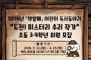 (케이엠뉴스) 인천광역시교육청주안도서관은 오는 23일부터 초등 3~4학년 학생을 대상으로 ‘책열매’ 독서동아리 회원을 모집한다. ‘도전! 미스터리 추리 작가’를 주제로 한 이번 프로그램은 어린이가 독서지도 전문 강사의 지도 아래 꾸준한 독서 습관을 기르고, 또래 친구들과 책으로 소통하는 경험을 쌓을 수 있도록 마련했다. 프로그램은 매주 미스터리 주제의 다양한 책을 읽고 수수께끼 만들기, 탐정일지 쓰기, 같은 시작 다른 결론, 뒷이야기 쓰기 등의 활동을 하며, 학생들이 직접 추리 동화를 창작하는 과정으로 3월 12일부터 4월 23일까지 운영한다. 모집은 2월 23일 오전 10시부터 주안도서관 누리집에서 선착순 진행하며, 자세한 내용은 주안도서관 누리집을 확인하거나 어린이자료실로 문의하면 된다.