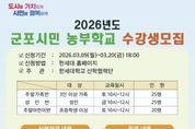 (케이엠뉴스) 군포시 도시농업 활성화 지원사업 보조사업자인 한세대학교가 오는 3월 20일까지 2026년도 군포시민 농부학교 신규 수강생을 모집한다고 밝혔다. 군포시민 농부학교는 군포시민들이 도심 속에서 직접 작물을 재배하며 친환경적인 삶의 태도를 함양하고, 이웃과 소통하는 공동체 문화를 회복하기 위해 마련됐다. 특히 단순한 농사 기술 습득을 넘어 이론과 실습이 병행된 체계적인 커리큘럼을 제공할 예정이다. 올해 모집 규모는 성인반 25구좌, 주말가족반 25구좌, 주말어린이반 20구좌로 총 70구좌이며, 교육은 한세대학교 내 위치한 도시농업지원센터 전용 농장에서 진행된다. 운영 기간은 3월부터 12월까지 약 10개월간이며 총 20강에 걸쳐 절기별 작물 재배법과 생태 교육 등 다채로운 프로그램이 이어진다. 신청 접수는 3월 9일부터 3월 20일까지 진행되며 자세한 커리큘럼 및 접수 방법은 한세대학교 홈페이지 공지사항을 통해 확인할 수 있다. 군포시 관계자는 “도시농업은 먹거리를 생산하는 즐거움을 넘어 기후 위기 시대에 탄소 중립을 실천하는 소중한 발걸음이 될 것”이라며 “많은 시민이 흙을 만지며 정서적