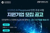 (케이엠뉴스) 인천테크노파크(인천TP)는 지역 중소기업의 인공지능 전환(AX) 촉진과 산업 경쟁력 강화를 위해 ‘2026년 AI 플레이그라운드 인천 조성사업’의 참여기업을 오는 30일까지 모집한다고 밝혔다. 이번 사업은 AI와 AX 관련 기업 총 39개사를 선정해 지원할 예정이며, 선정된 기업에는 프로그램에 따라 기업당 최대 1억 원의 사업비가 지원된다. 세부 프로그램은 ▲AI 기술개발 ▲AI 사업화 ▲AX 컨설팅 ▲AX 전환지원(AI 내재화) 등 4개 트랙으로 구성된다. 모집 대상은 인천 관내 중소기업으로, AI 기술 보유 단계나 도입 희망 여부에 따라 적합한 프로그램을 선택해 신청할 수 있다. 지원 신청은 오는 4월 30일 오후 5시까지이며, 비즈오케이(Biz-OK) 또는 인천R&D관리시스템을 통해 온라인으로 접수하면 된다. 다만, 프로그램별로 접수 기간이 다를 수 있어 공고문을 반드시 확인해야 한다. 자세한 내용은 인천TP 홈페이지 지원사업 게시판을 확인하거나, AI혁신센터로 문의하면 된다. 인천TP 관계자는 “이번 사업은 인천의 중소기업들이 급변하는 산업 환경 속에서