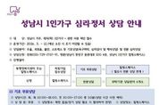 (케이엠뉴스) 성남시는 우울감이나 외로움, 불안감, 스트레스로 어려움을 겪는 1인 가구에 전문적인 심리·정서 상담을 지원한다고 5일 밝혔다. 이를 위해 최근 공모로 선정한 6곳 전문상담센터와 1인 가구 심리·정서 상담 수행에 관한 업무 협약을 했다. 협약한 상담센터는 △엠브레스 마인드 심리상담센터(분당구 구미동 소재) △온새미 심리상담센터(분당구 금곡동) △심리상담연구소 사람과 사람 위례점(수정구 창곡동) △㈜분당심리상담센터 아이엠미(분당구 야탑동) △속편한 심리상담센터(수정구 창곡동) △㈜마음꼭 차심리상담센터(분당구 야탑동)다. 이들 전문상담센터 이용 신청은 성남시 1인가구 힐링 스페이스(중원구 둔촌대로 100, 4층, ☏031-729-1756~9)나 거주지 동 행정복지센터 등에서 하면 된다. 성남시는 전문상담센터에서의 1인 가구 심리·정서 상담 지원을 위해 올해 5000만원의 사업비를 투입한다. 상담 지원 횟수는 최대 12회다. 1~8회 상담은 성남시가 비용(회당 4만~6만원)을 지원해 무료다. 나머지 9~12회 상담은 비용의 10%(4000~6000원)를