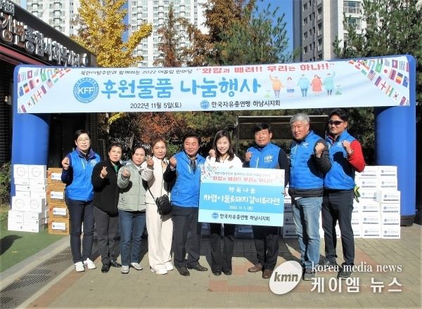 (케이엠뉴스) 한국자유총연맹 하남시지회는 11월 5일 하남시사회종합복지관 앞에서 관내 거주하는 북한이탈주민에게 이불, 생활용품, 식료품 등으로 구성된 후원 물품을 전달했다.
