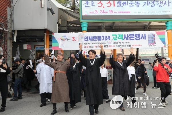 (케이엠뉴스) 지난 31일 104년 전 독립을 향한 우리 민족의 결연한 의지를 보여준 대한독립 만세 함성과 태극기 물결이 군포역 앞 항일독립만세운동 기념탑 일대에서 재연됐다.