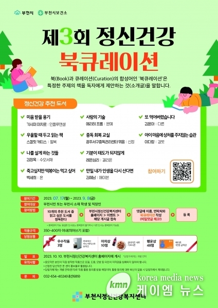(케이엠뉴스) 부천시와 부천시정신건강복지센터는 날로 증가하는 정신건강에 대한 인식과 이해를 높이고 정신질환에 대한 사회적 인식을 개선하기 위해 ‘제3회 정신건강 북큐레이션’을 실시한다.
