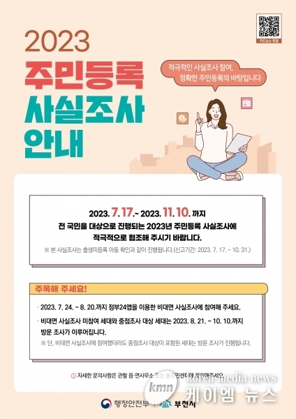 (케이엠뉴스) 부천시는 전 시민을 대상으로 7월 17일부터 11월 10일까지 ‘2023년 주민등록 사실조사’를 실시한다.