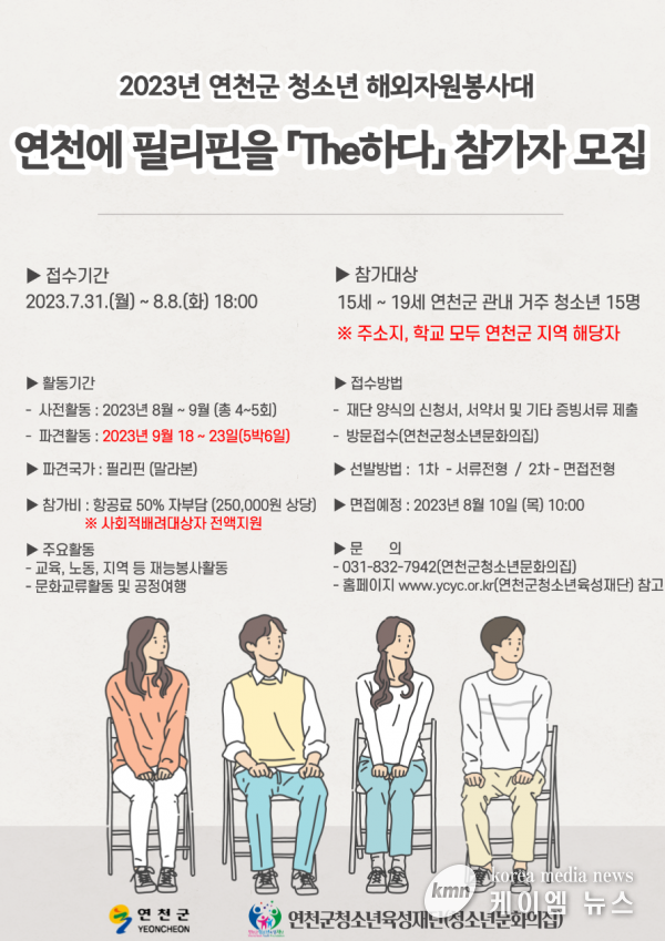 (케이엠뉴스) 연천군청소년육성재단은 오는 8일까지 청소년해외자원봉사 ‘연천에 필리핀을 The하다’ 참가자를 모집한다고 1일 밝혔다.