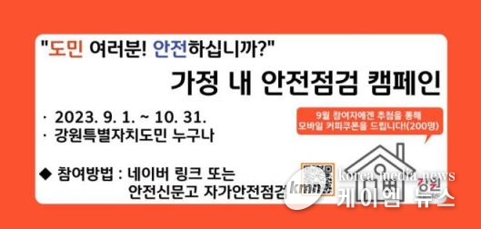 (케이엠뉴스) 강원특별자치도는 생활 속 재난을 예방하기 위해 9월 1일부터 10월 31일까지 가정 내 안전점검 2차 캠페인을 실시한다.