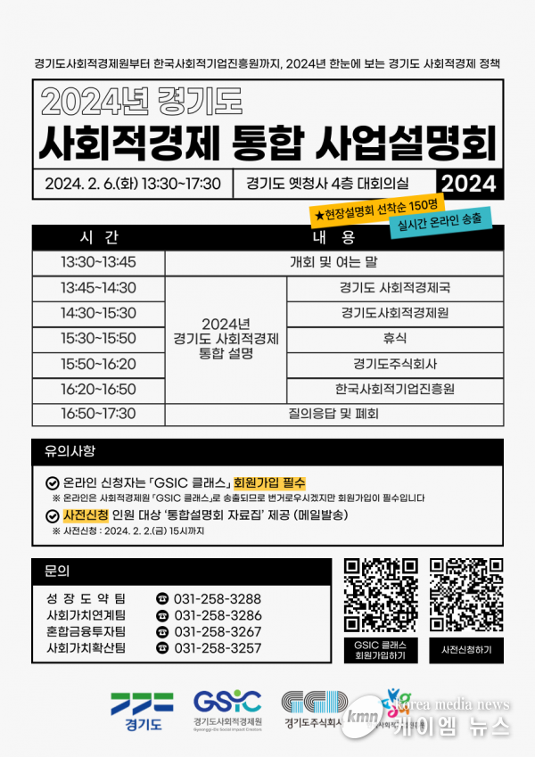 경기도 사회적경제국, 경기도사회경제원, 코리아경기도주식회사, 한국사회적기업진흥원 등 사회적경제 주요 유관기관은 2월 6일 오후 1시 30분 경기도청 옛 청사 신관 4층 대회의실에서 ‘2024 경기도 사회적경제 통합 사업설명회’를 열고 이 같은 내용을 공유한다.