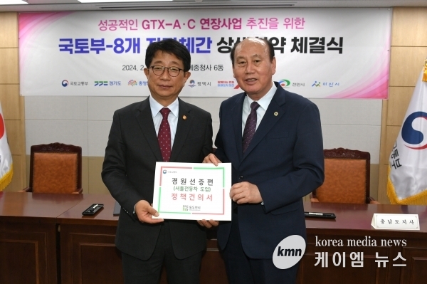 (케이엠뉴스) 동두천시는 22일 오후 2시, GTX-C 노선 연장 사업의 성공적인 추진과 협의체 구성을 위해 국토교통부와 상생협약식을 개최했다고 밝혔다.