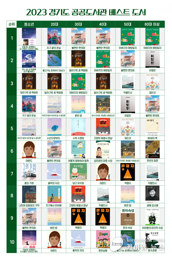 (케이엠뉴스) 지난 한 해 경기도민이 공공도서관에서 가장 많이 빌려 본 책은 1만 5,437건의 대출 수를 기록한 김호연 작가의 ‘불편한 편의점’인 것으로 조사됐다.