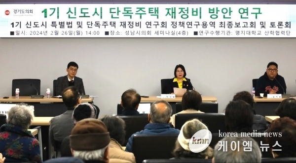 (케이엠뉴스) 경기도의회 안전행정위원회 이서영 의원이 회장으로 있는 경기도의회 의원 연구단체인 “1기 신도시 특별법 및 단독주택 재정비 연구회”는 2월 26일 성남시의회 의원세미나실에서 ‘1기 신도시 단독주택 재정비 방안 연구용역’의 최종보고회 및 토론회를 개최했다.