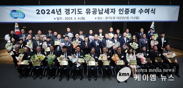 (케이엠뉴스) 김동연 경기도지사는 4일 납세자의 날을 맞아 도청사에서 2024년 유공납세자 인증패 수여식을 열고 지역을 대표하는 44개 기업 대표자에게 인증패를 전달했다.