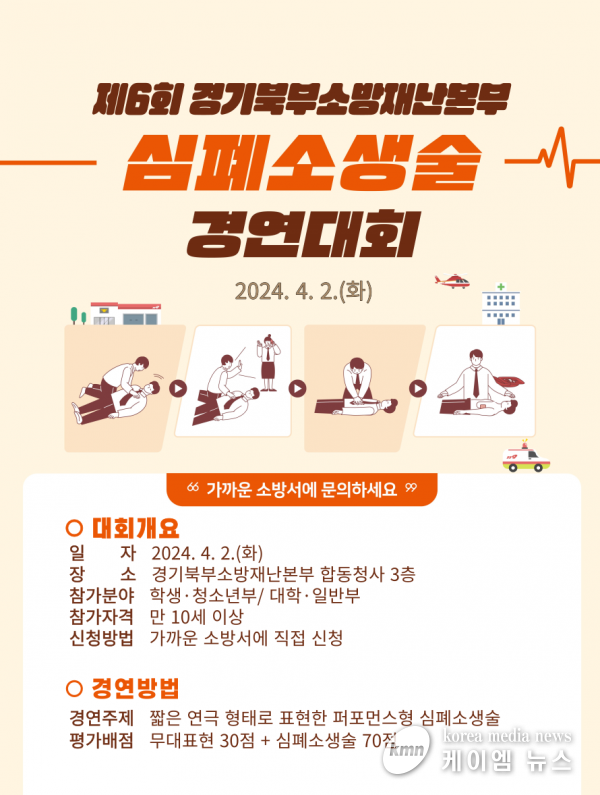 (케이엠뉴스) 경기도북부소방재난본부가 도민들의 심폐소생술에 대한 관심과 이해도를 높이기 위해 오는 4월 2일 북부소방재난본부 합동청사에서 심폐소생술 경연대회를 연다.