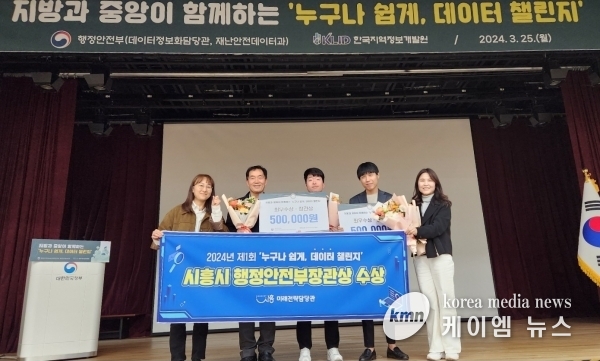 (케이엠뉴스) 시흥시는 행정안전부와 한국지역정보개발원이 주최한 ‘누구나 쉽게, 데이터 챌린지 대회’에서 시의 2개 과제가 최우수 과제로 선정돼 행정안전부 장관상을 수상했다고 지난 27일 밝혔다.