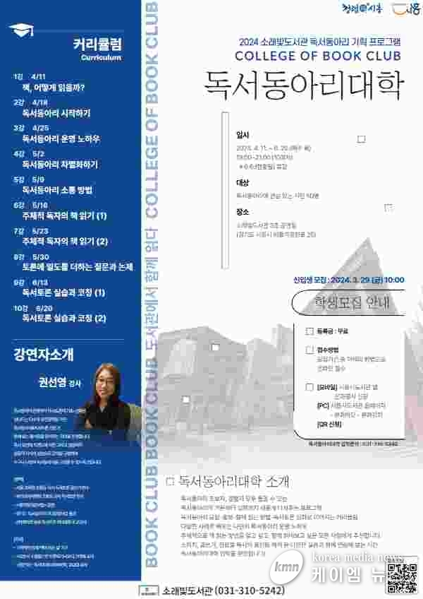 (케이엠뉴스) 시흥시 소래빛도서관은 4월 11일부터 6월 20일까지 함께 책 읽는 즐거움을 알려줄 ‘독서동아리 대학’ 프로그램을 매주 목요일 오후 7시부터 소래빛도서관 3층 공연장에서 운영한다.