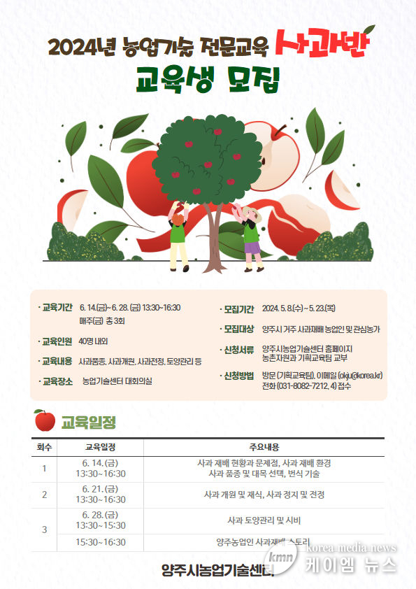 (케이엠뉴스) 양주시가 오는 5월 23일까지 2024년 농업기술 전문교육 교육생 40명을 모집한다.