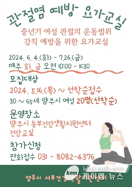 (케이엠뉴스) 양주시가 오는 16일부터 관내 주민등록을 둔 30세부터 65세 여성 시민을 대상으로 ‘2024년 관절염 예방 요가 교실’ 1기 참여자 20명을 선착순 모집한다고 밝혔다.