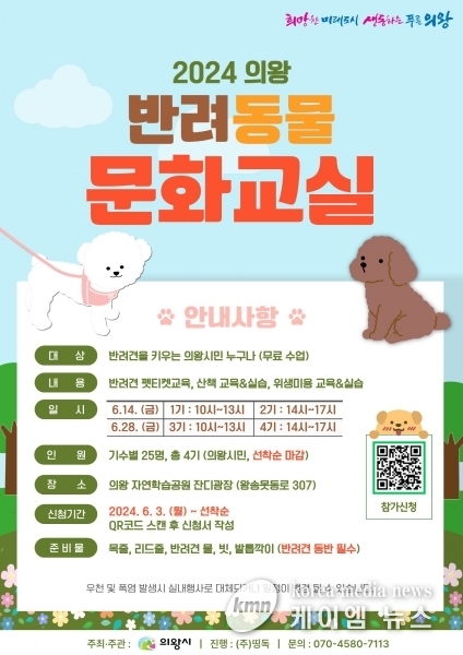 (케이엠뉴스) 의왕시는 오는 6월 14일과 28일 왕송호수 잔디광장에서 오전, 오후 3시간씩 총 4차례 반려동물 문화교실을 진행한다고 밝혔다.