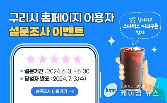 (케이엠뉴스) 구리시는 6월 3일부터 6월 30일까지 구리시 홈페이지 이용자를 대상으로 ‘홈페이지 이용자 설문조사 이벤트’를 실시한다.