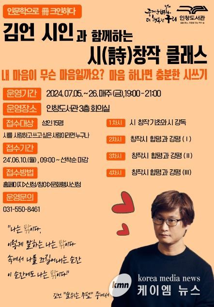 7월 시창작 클래스 '김언 시인과 함께하는 내 마음이 무슨 마음일까요? : 마음 하나면 충분한 시(詩)쓰기 '는 시창작과 강독의 기초, 합평으로, 오는 7월 5일부터 7월 26일까지 매주 금요일, 인창도서관 3층 회의실에서 운영된다. 참여 대상은 15명이며, 6월 10일부터 인창도서관 홈페이지를 통해 선착순으로 접수받는다.