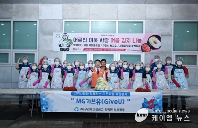 이번 활동은 구리 새마을금고 임직원 30명이 정성스럽게 담근 여름 김치를 ‘사랑나누미’ 봉사 단체에서 결연 어르신 30명에게 전달하는 것으로 진행됐다.