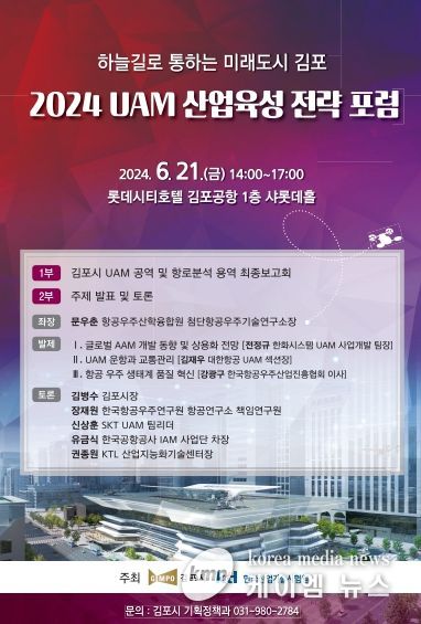 (케이엠뉴스) 김포시는 6월 21일 김포공항 롯데시티호텔에서 2024 UAM 산업육성 전략 모색을 위한 전문가 포럼을 개최한다.