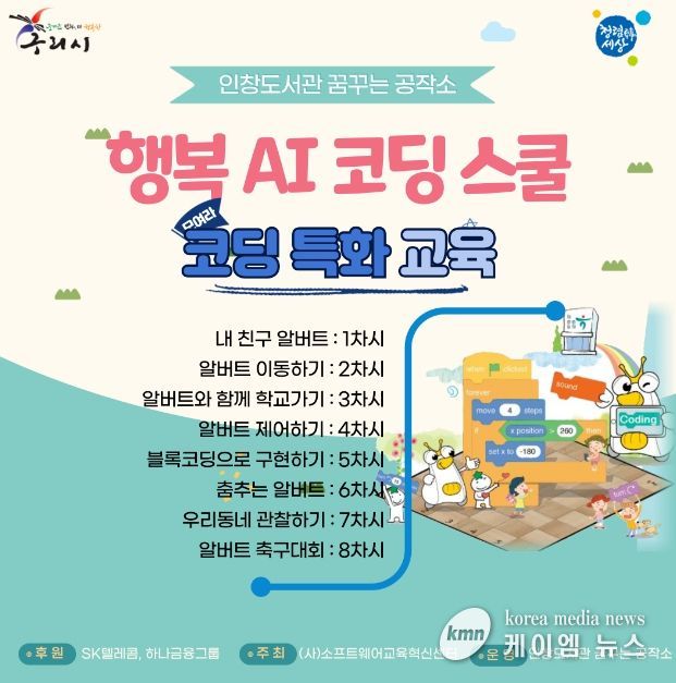 (케이엠뉴스) 구리시 인창도서관 꿈꾸는공작소는 SK텔레콤과 하나금융그룹 후원, (사)소프트웨어교육혁신센터가 주관하는 ‘행복AI코딩스쿨’ 공모사업에 선정되어 장애청소년을 대상으로 하는 AI코딩프로그램을 운영하고 있다.