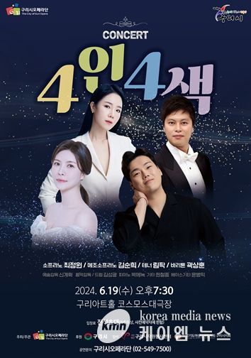 (케이엠뉴스) 구리시오페라단은 오는 6월 19일 오후 7:30 구리아트홀 코스모스 대극장에서 대한민국 성악계의 빅스타 4인이 꾸미는 '콘서트 4인4색'을 개최한다.