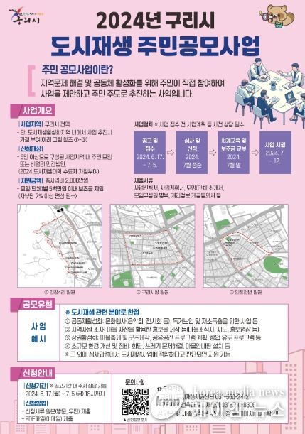 ‘2024년 구리시 도시재생 주민 공모사업’은 주민들이 직접 제안하는 아이디어에 대해 심사를 통해 선정하고 직접 운영토록 사업비를 지원한다. 총예산은 2천만 원이며, 선정된 각 사업당 최대 5백만 원의 지원을 받을 수 있다.