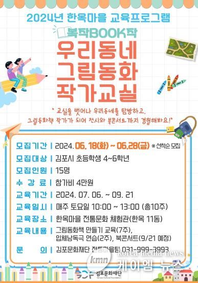 (케이엠뉴스) (재)김포문화재단이 6월 18일부터 28일까지 어린이 종합 문화예술교육 프로그램 '복작BOOK작-우리 동네 그림동화 작가교실'의 참가자를 모집한다.
