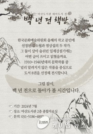 (케이엠뉴스) 김포시 마산도서관이 7월 테마도서 전시 ‘2024년 올해의 작고 문인-백 년 전 책방’을 오는 7월 2일부터 31일까지 한 달간 마산도서관 2층 종합자료실에서 운영한다.